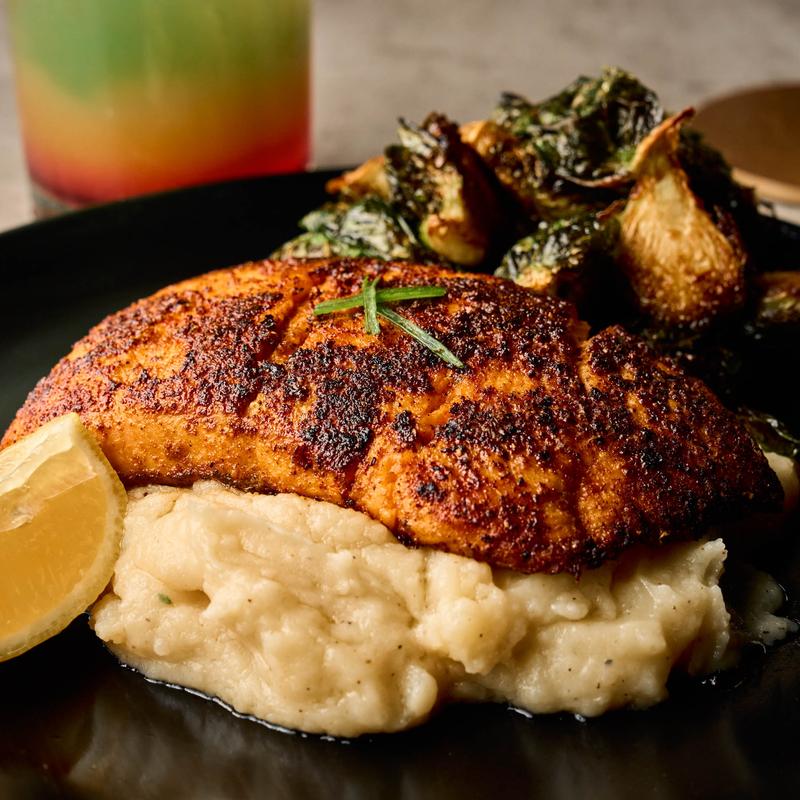 Our signature Shrimp and Grits features tender, large sautéed shrimp, served on a creamy bed of savory seasoned grits, topped with a creamy Cajun sauce.