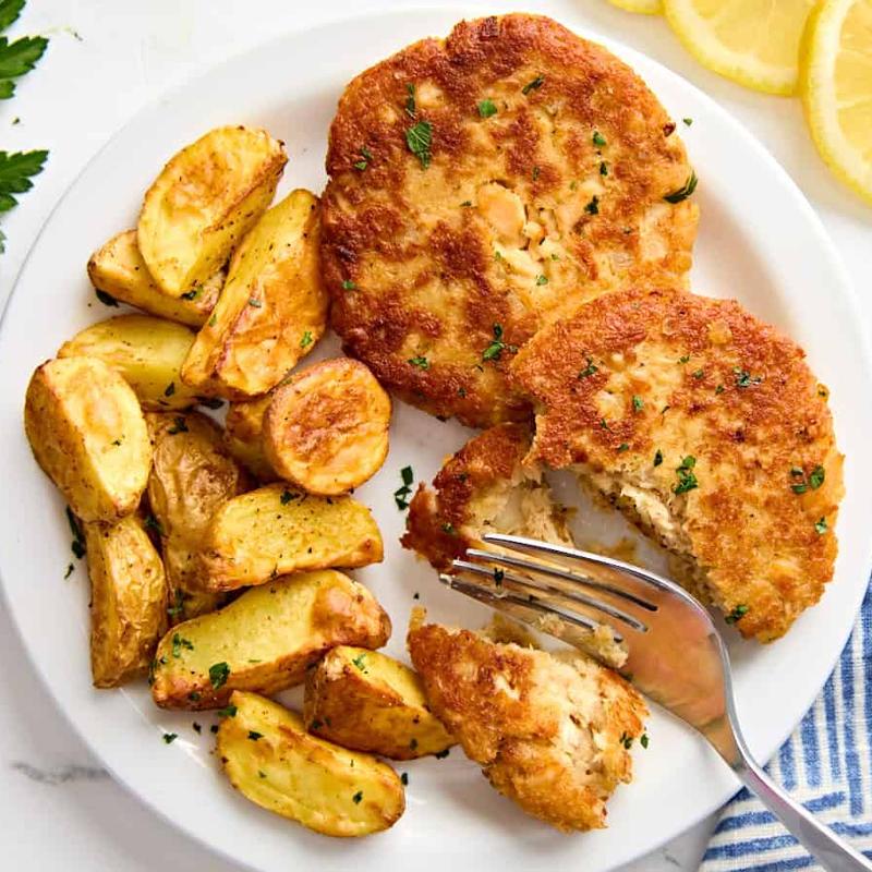 2 Salmon Cakes, grits or potatoes, 2 eggs your way