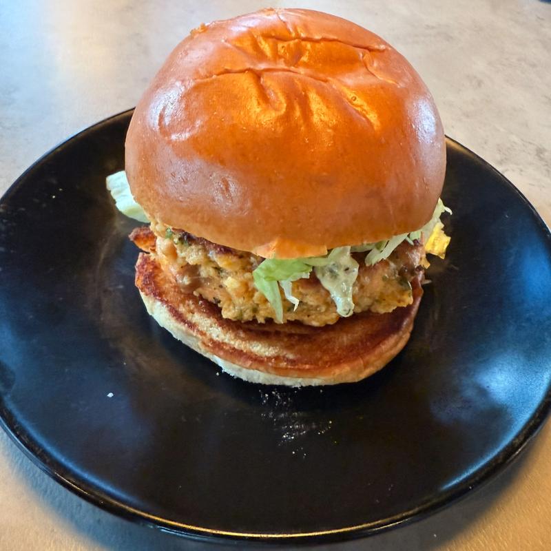 Salmon Filet (grilled or fried) on a toasted Brioche Bun; Topped with Lettuce and Tomato & a side of Ketchup