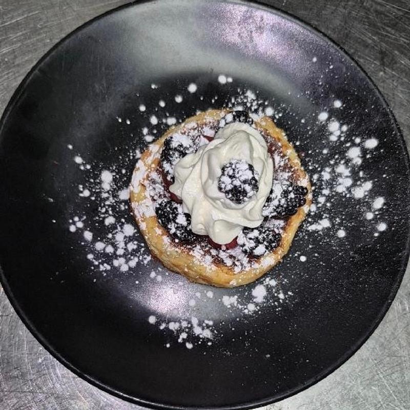 2 golden pancakes topped with powdered sugar, blueberries, and strawberries. Served with 2 eggs your way and choice of bacon or sausage